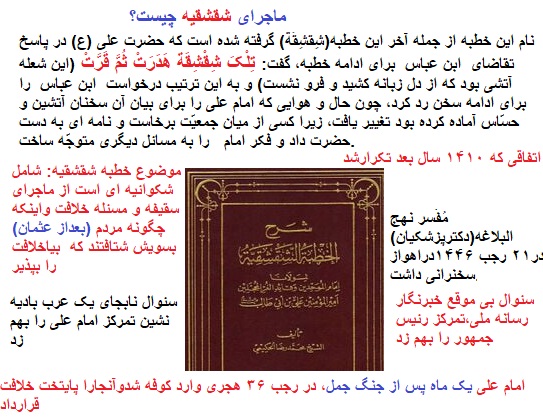 درپایان به «خُطبه شِقشِقیه»(خطبه سوم نهج البلاغه) پرداخته ایم وعلت نامگذاری این خطبه(تِلْکَ شِقْشِقَة هَدَرَتْ ثُمَّ قَرَّتْ)چرا امام علی سخنرانی خودراادامه نداد؟.