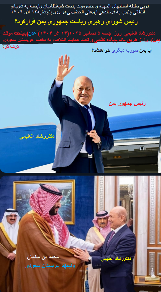 «رشادالعلیمی»(رئیس شورای ریاست جمهوری یمن)روز جمعه ۵ دسامبر ۲۰۲۵(۱۴ آذر ۱۴۰۴) عدن(پایتخت موقت یمن)، را از طریق یک پایگاه نظامی ، تحت حمایت ائتلاف، به مقصد «عربستان سعودی» ترک کرد ..