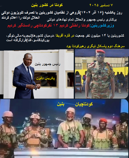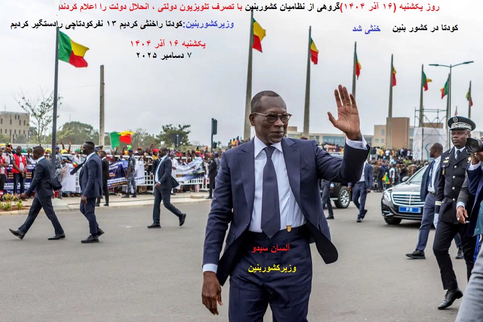 توضیح مدیریت سایت-پیراسته فر:روز یکشنبه ۷ دسامبر ۲۰۲۵(۱۶ آذر ۱۴۰۴)گروهی از نظامیان کشوربنین با تصرف تلویزیون دولتی بنین ، انحلال دولت را اعلام کردند.