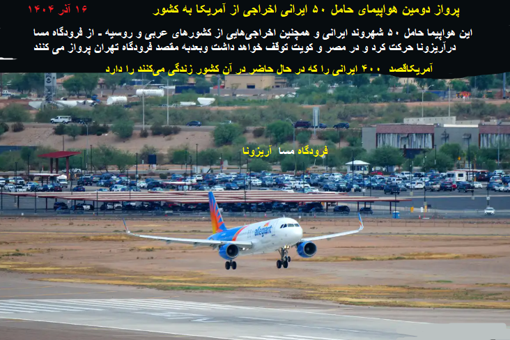توضیح مدیریت سایت-پیراسته فر:هواپیما حامل ۵۰ شهروند ایرانی و همچنین اخراجیهایی از کشورهای عربی و روسیه - از فرودگاهی در«مسا»(آریزونا)حرکت کرد و در مصر و کویت توقف خواهد داشت وبعدبه مقصد فرودگاه تهران پرواز می کنند.