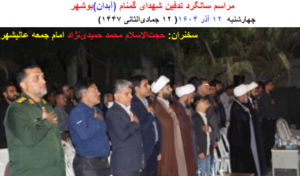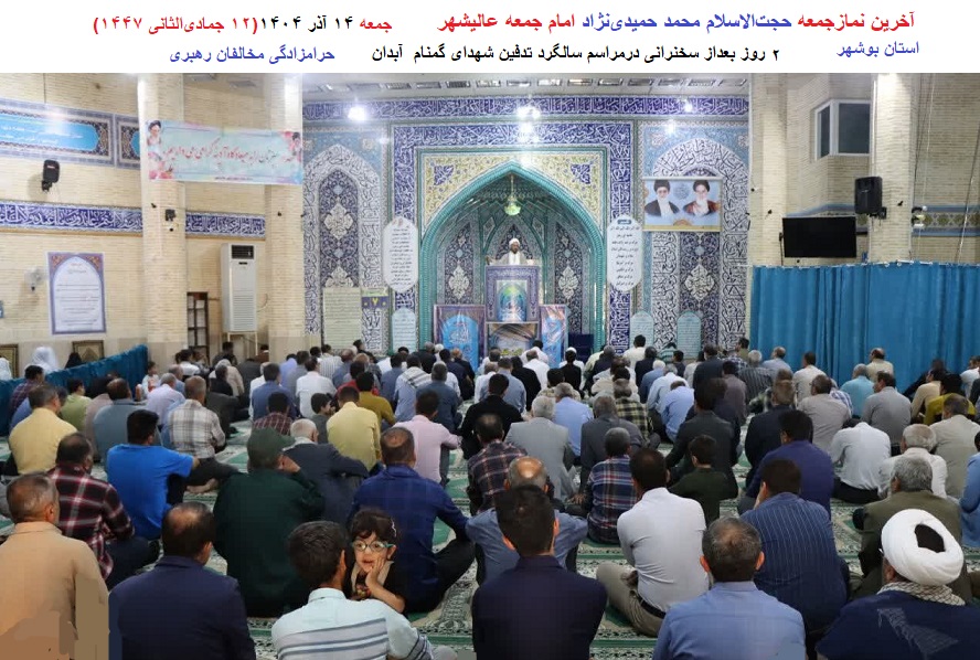 سخنان حجتالاسلام محمد حمیدینژاد «امام جمعه عالیشهر» در روز چهارشنبه ۱۲ آذر ۱۴۰۴( ۱۲ جمادیالثانی ۱۴۴۷)درسالگرد تدفین شهدای گمنام«شهرآبدان»(استان بوشهر):
