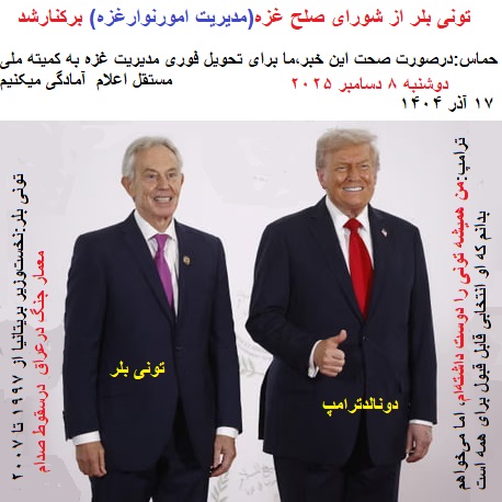 فایننشال تایمز در روز دوشنبه ۸ دسامبر ۲۰۲۵(۱۷ آذر ۱۴۰۴)نوشت:«تونی بلر»بیسروصدا از فهرست گزینههای «هیئت صلح» ترامپ که ترامپ گفته است ریاست آن را بر عهده خواهد گرفت، کنار گذاشته شده است.