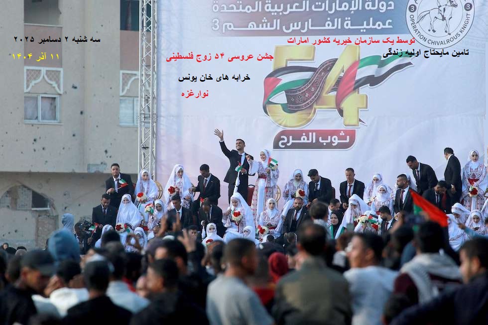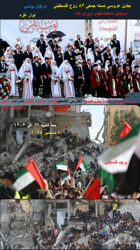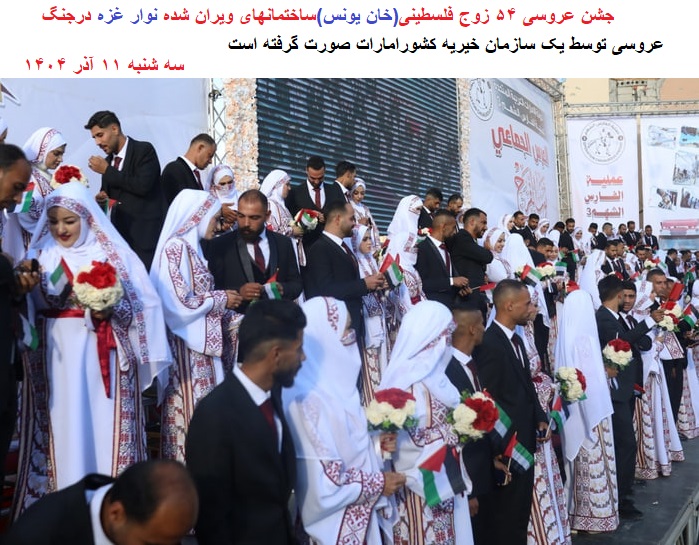 توضیح مدیریت سایت-پیراسته فر:جشن عروسی ۵۴ عروس و داماد در یک مراسم عروسی دسته جمعی در «خان یونس»(جنوب نوار غزه) سه شنبه ۲ دسامبر ۲۰۲۵(۱۱ آذر ۱۴۰۴).