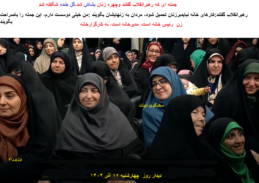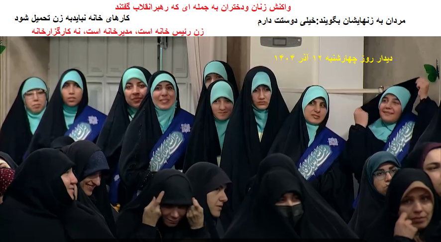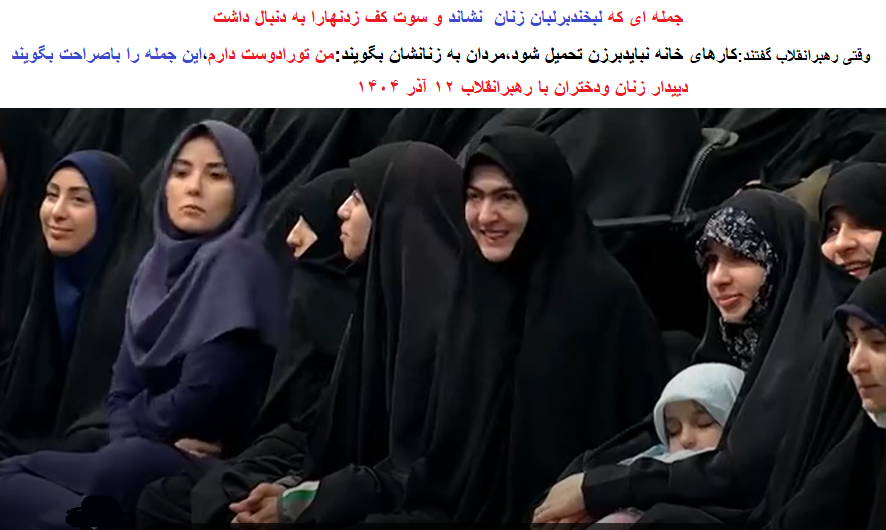رهبر انقلاب:کارهای خانه به زن، تحمیل نباید شود،روایت وارد شده که مردها به زنهایشان بگویند:«من تو را دوست دارم »تصریح کننداین جمله را(واکنش خانمهای حاضر درجلسه):لبخند،سوت وکف زدن وهورا کشیدن.