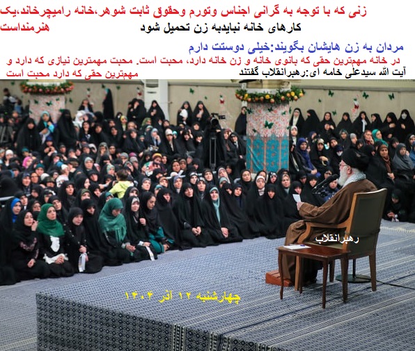 «گزارش ایرنا از پایگاه اطلاعرسانی دفتر مقام معظم رهبری،حضرت آیت الله خامنه ای» صبح روز چهارشنبه ۱۲ آذر ۱۴۰۴(۱۲ جمادیالثانی ۱۴۴۷)در دیدار هزاران نفر از زنان و دختران مناطق مختلف کشور، حضرت فاطمه زهرا(س) را در همه عرصهها یک انسان عرشیِ آراسته به والاترین خصوصیات خواندند و با تبیین نگاه اسلام به شأن و حقوق زنان در عرصه خانه و اجتماع، بایدها و نبایدهای رفتار مردان با همسران و زنان را در زمینههای مختلف تشریح کردند.