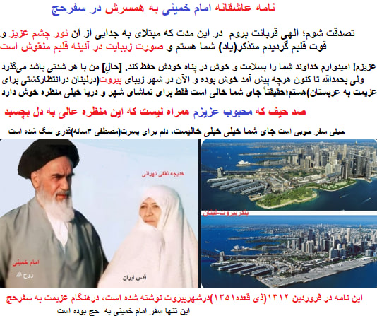 توضیح مدیریت سایت-پیراسته فر:نامه عاشقانه امام خمینی به همسرش درایام عید-فروردین ۱۳۱۲مصادف با(ذی قعده۱۳۵۱)بیروت-درهنگام سفرحج (لبنان)نوشته وبه ایران ارسال کرده است.