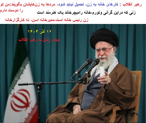 آیت الله خامنه ای:زن«گُل» است ، نه«کارگزار و مأمور انجام کارهای خانه»:باید با پرهیز از عتاب و خطاب زن، او را همچون گل مراقبت و محافظت کرد تا او نیز خانه را از رنگ و عطر خود برخوردار سازد.