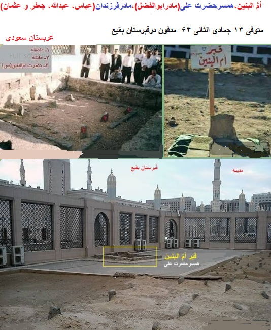 «فاطمه ام البنین» (علیهاالسلام)، همسر علی(علیهالسلام) و مادر فرزندان(ابوالفضل العباس، عبدالله، جعفر و عثمان)..متوفی ۱۳ جمادی الثانی ۶۴ مدفون درقبرستان بقیع.