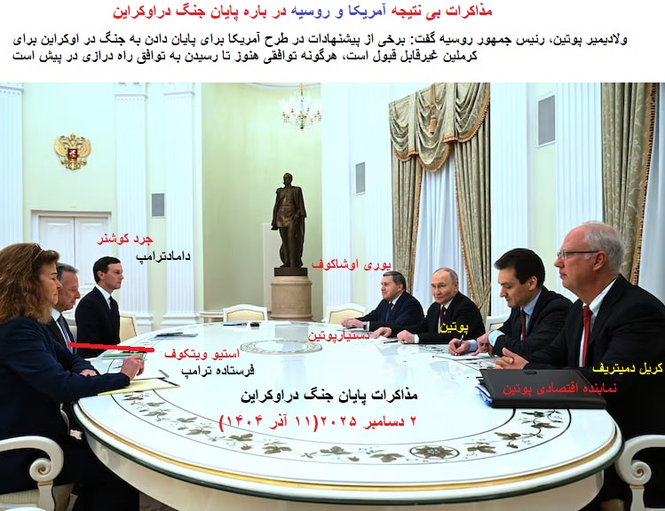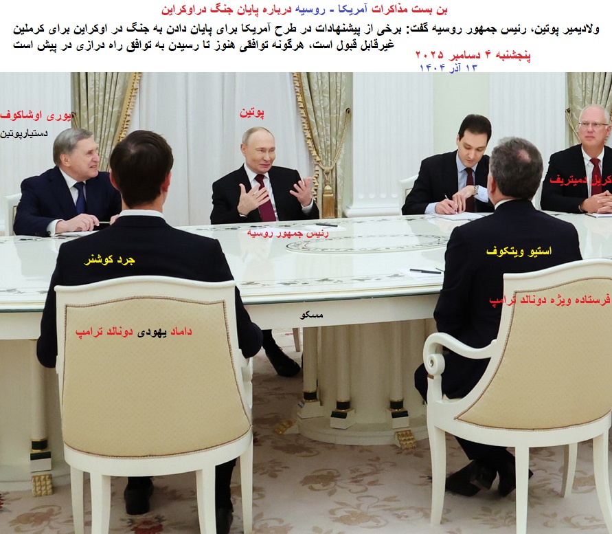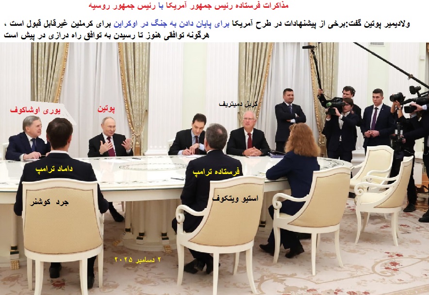 «ولادیمیر پوتین»(رئیس جمهور روسیه) در تاریخ ۲ دسامبر ۲۰۲۵، دیداری را با «استیو ویتکوف»( فرستاده ویژه ترامپ)، و «جارد کوشنر»(دامادیهودی ترامپ) در مسکو آغاز میکند