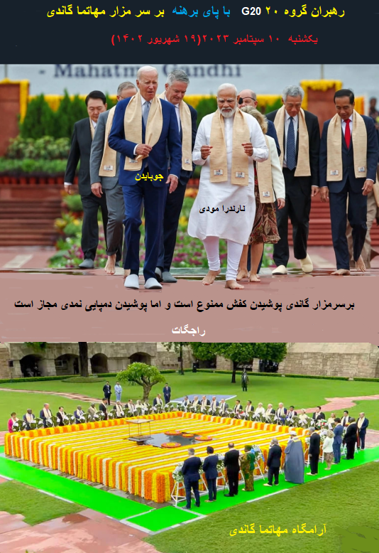رهبران گروه ۲۰(G20)با پای برهنه برسر قبر مهاتماگاندی ۱۰ سپتامبر ۲۰۲۳ (۱۹ شهریور ۱۴۰۲)جوبایدن،امانوئل مکرون،ریشی سوناک،اورسولا فون در لاین ..چارلز میشل و...