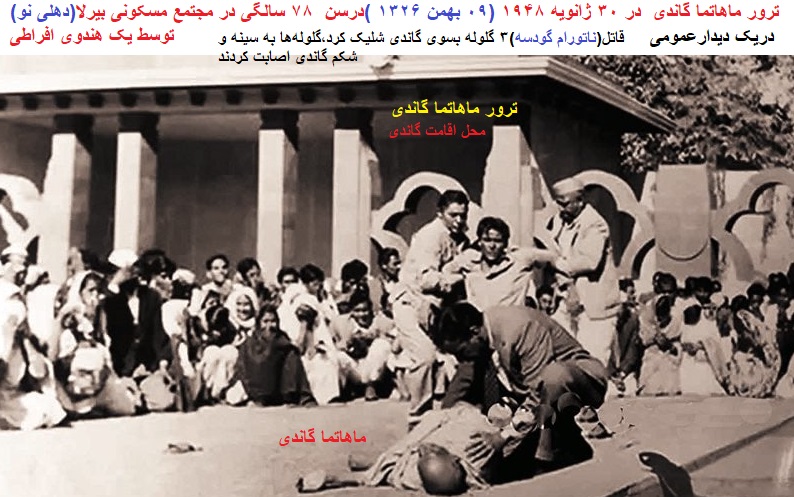 «ترور ماهاتما گاندی»(معماراستقلال هندوستان) در ۳۰ ژانویه ۱۹۴۸(۰۹ بهمن ۱۳۲۶)درسن ۷۸ سالگی درمحل اقامتش واقع در «مجتمع مسکونی بیرلا»(دهلی نو)توسط یک هندوی افراطی.
