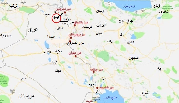 اربیل(اقلیم کردستان عراق)با کدام شهرهای ایران(همسایه)نقشه