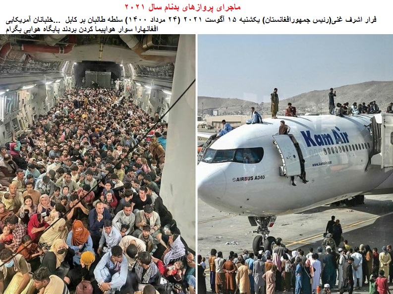 توضیح مدیریت سایت-پیراسته فر:«فرار اشرف غنی»(رئیس جمهورافغانستان) یکشنبه ۱۵ آگوست ۲۰۲۱ (۲۴ مرداد ۱۴۰۰) «حاکمیت گروه طالبان» و آنگاه خلبانان آمریکایی مردم افغان را رایگان سوارهواپیماکردند به بلگرام بردند.