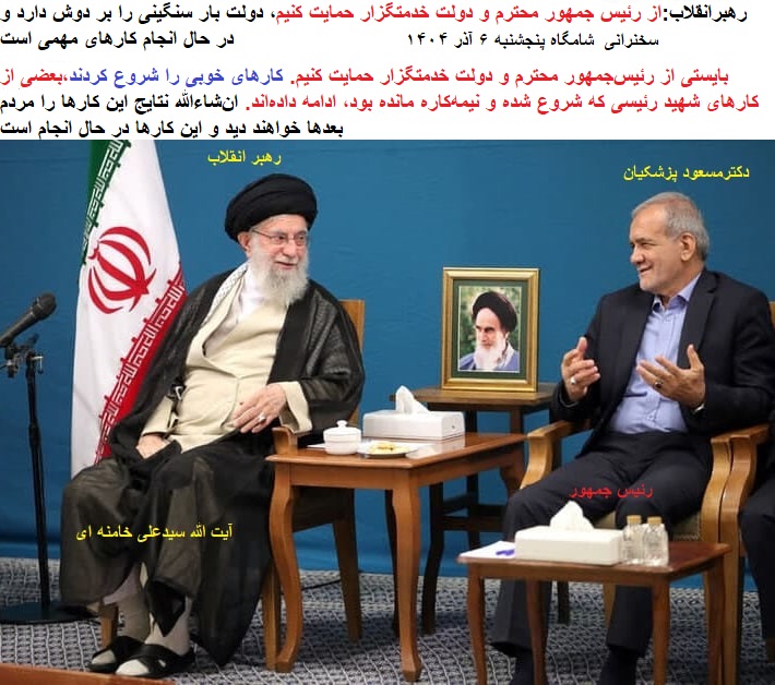 آیت الله سیدعلی خامنه ای:«از رئیس جمهور محترم و دولت خدمتگزار حمایت کنیم، دولت بار سنگینی را بر دوش دارد و در حال انجام کارهای مهمی است»