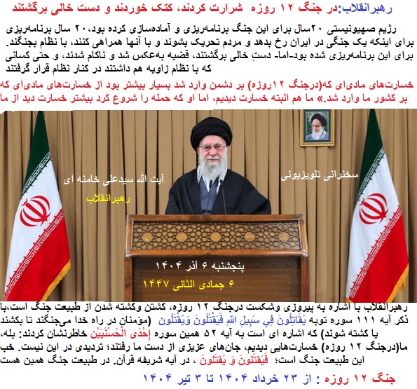 رهبر معظم انقلاب اسلامی در بخش دیگری از سخنان خود به ابعاد مختلف «جنگ دوازده روزه» اشاره کرده و فرمودند: در جنگ دوازدهروزه، ملت ایران هم آمریکا را شکست داد هم صهیونیستها را شکست داد؛ بدون تردید. آمدند شرارت کردند، کتک خوردند و دستِ خالی برگشتند. این شکست به معنای واقعی کلمه این است. بله، شرارت کردند اما دست خالی برگشتند، یعنی به هیچکدام از هدفهای خودشان نرسیدند.