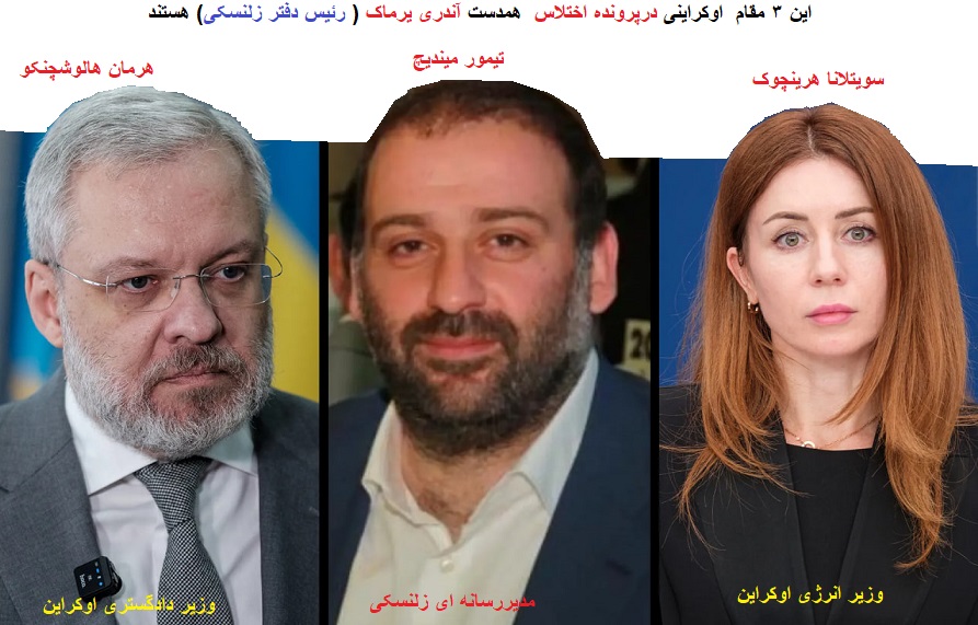 (از چپ به راست) «هرمان هالوشچنکو» (وزیر دادگستری اوکراین)، «تیمور میندیچ»(تهیهکننده فیلم و از مالکان شرکت تولید فیلم کوارتال ۹۵ رئیس جمهور ولودیمیر زلنسکی) و خانم«سویتلانا هرینچوک»(وزیر انرژی اوکراین)در رسوایی فساد جاری اوکراین دست دارند.
