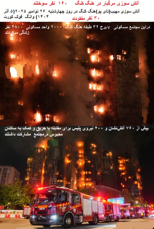 در جریان یک آتشسوزی مهیب در چند برج مسکونی در هنگ کنگ، دستکم ۱۶۰ تن، از جمله یک آتشنشان ۳۷ ساله کشته شدند./چهارشنبه ۲۶ نوامبر ۲۰۲۵(۵ آذر ۱۴۰۴)