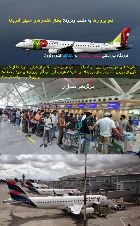 «پس از هشدار آمریکا در مورد وخامت اوضاع امنیتی و فعالیتهای نظامی، خطوط هوایی پروازهای بینالمللی به ونزوئلا را لغو کردند.»