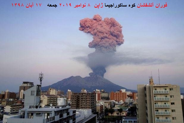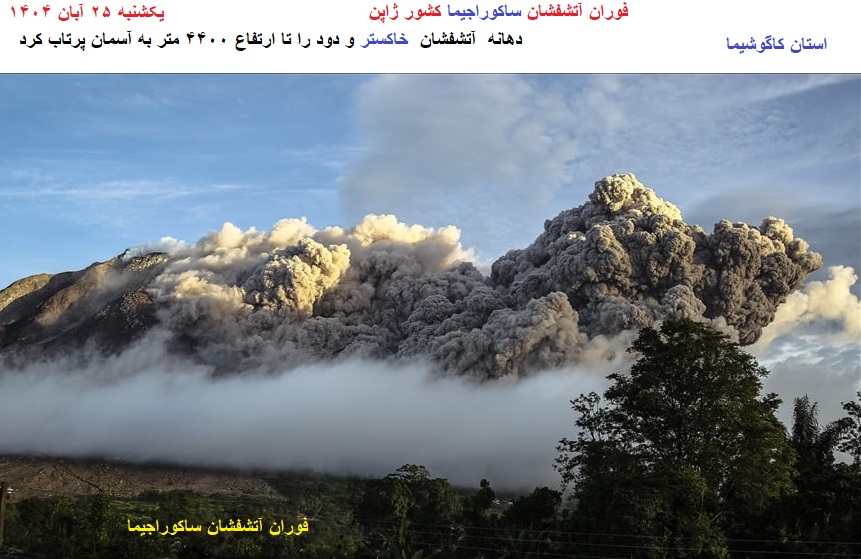 «آتشفشان ساکوراجیما»(Sakurajima volcano) در «استان کاگوشیما»(در جنوب غربی ژاپن) اوایل روز یکشنبه ۱۶ نوامبر ۲۰۲۵(۲۵ نوامبر ۱۴۰۴) فوران کرد و خاکستر و دود را تا ارتفاع ۴۴۰۰ متر پرتاب کرد.