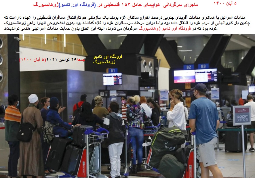 توضیح مدیریت سایت-پیراسته فر:مقامات اسرائیل با همکاری مقامات آفریقای جنوبی درصدد اخراج ساکنان غزه بودند،یک سازمانی هم کارانتقال مسافران فلسطینی را عهده داراست که چندین بار کاروانهایی از مردم غزه را انتقال داده بود واما دراین مرحله سرمسافران غزه را کلاه گذاشته بود،بدون اخذخروجی آنهارا راهی ژوهانسبورک کرده بود که در «فرودگاه اور تامبو ژوهانسبورگ» سرگردان می شوند، البته این اتفاق بدون حمایتهای پیدوپنهان مقامات اسرائیلی هانمی تواندباشد.