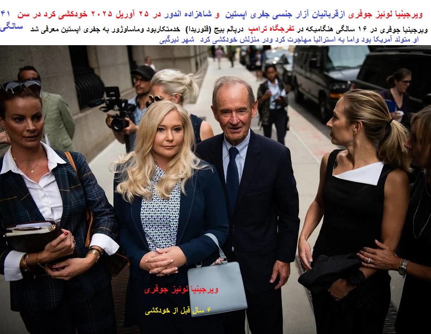 «ویرجینیا لوئیز جوفری» یکی از شناخته شده ترین قربانیان آزار جنسی «جفری اپستین» ، ۲۵ آوریل ۲۰۲۵( ۵ اردیبهشت ۱۴۰۴)درمحل زندگیش«نیرگبی»(استرالیا) براثرخودکشی جان باخت درسن ۴۱ سالگی.