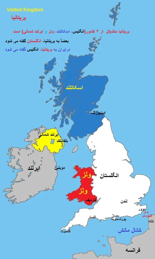 توضیح مدیریت سایت-پیراسته فر:نام اصلی بریتانیا :United Kingdom (پادشاهی متحده بریتانیای کبیر و ایرلند شمالی) است که علامت اختصاری آن«UK» است وشامل چهار کشور با نام های :«انگلیس»(England)، «اسکاتلند»(Scotland)، «ایرلند شمالی»(Northern Ireland)» و «ولز»(Wales)، است.