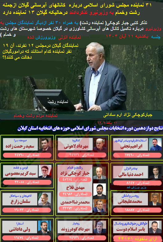 تذکر ۳۱تذکر ۳۱ نماینده به وزیر نیرو درموردآبرسانی کانالهای کشاورزی گیلان درحالیکه گیلان ۱۳ نماینده دارد!