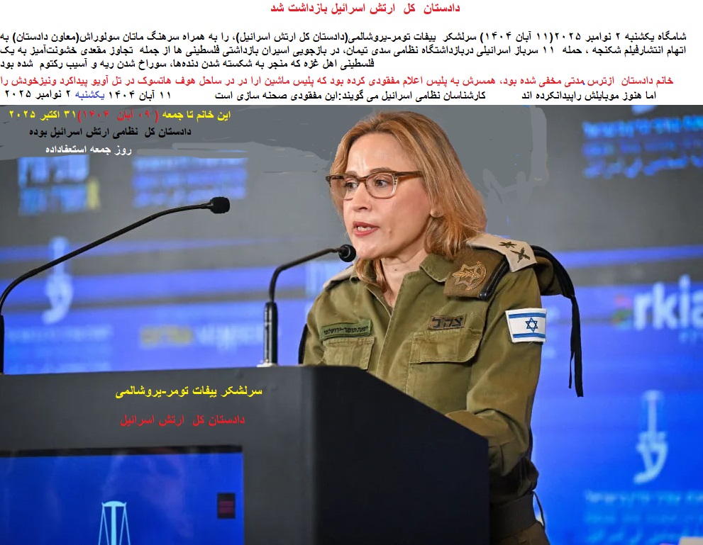 توضیح مدیریت سایت-پیراسته فر:شامگاه دوشنبه ۲ نوامبر ۲۰۲۵(۱۱ آبان ۱۴۰۴) پلیس اسرائیل، سرلشکر «ییفات تومر-یروشالمی»(دادستان کل سابق ارتش اسرائیل)، را به همراه «سرهنگ ماتان سولوراش»(دادستان کل سابق ارتش اسرائیل) به ظن کارشکنی در اجرای عدالت و نقض اعتماد پس از ناپدید شدن «سرهنگ ماتان سولوراش» در روز یکشنبه، دستگیر کرد،هر دو صبح دوشنبه ۳ نوامبر ۲۰۲۵(۱۲ آبان ۱۴۰۴) برای جلسه استماع به دادگاه احضار خواهند شد.