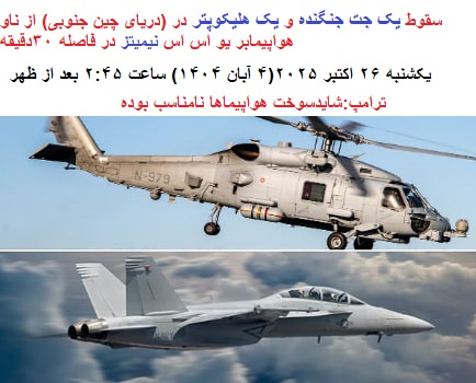 «یک هلیکوپتر و یک جت جنگنده سی هاوک متعلق به نیروی دریایی ایالات متحده ، روز یکشنبه(۲۶ اکتبر ۲۰۲۵) در حوادث غیرمرتبط بر فراز دریای چین جنوبی سقوط کردند.»