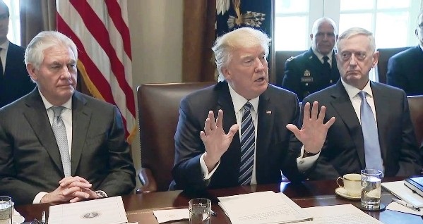 دونالد ترامپ دروسط وزیر خارجه آمریکا، رکس تیلرسون (چپ) و وزیر دفاع آمریکا جیمز متیس (راست)