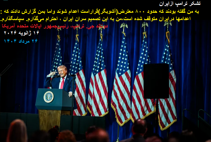 توضیح مدیریت سایت-پیراسته فر:رئیس جمهورآمریکا(ترامپ):به من گفته بودند که حدود ۸۰۰ معترض(آشوبگر)قراراست اعدام شوند واما بمن گزارش دادند که اعدامها درایران متوقف شده است،من به این تصمیم سران ایران ، احترام میگذارم. سپاسگذارم. دونالد جی. ترامپ، رئیسجمهور ایالات متحده آمریکا