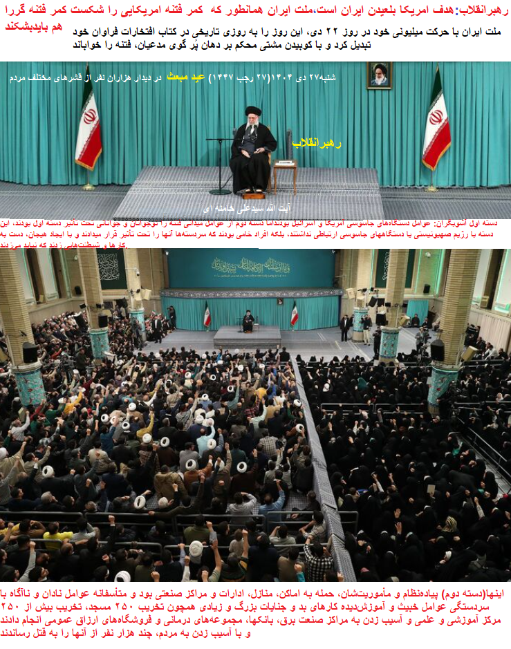 رهبر معظم انقلاب اسلامی امروز شنبه ۲۷ دی ۱۴۰۴(۲۷ رجب ۱۴۴۷) در خجسته عید شریف مبعث، در دیدار هزاران نفر از قشرهای مختلف مردم با اشاره به ظرفیت عظیم اسلام برای ایجاد تحولی مانند صدر اسلام در جامعه امروز بشری و تبدیل جوامع گرفتارِ جاهلیت و ظلم و زور و ترس و استکبار به جوامع برخوردار از صلاح و نجات و شرافت، به تبیین ابعاد فتنه اخیر و مواضع جمهوری اسلامی در مقابل طراحان و مشوّقان این فتنه آمریکایی پرداختند و با تجلیل از حرکت ملت در روز تاریخی ۲۲ دی، تأکید کردند: ملت ایران کمر فتنه را شکست، اما باید ماهیت و اهداف این فتنه و عوامل «آموزشدیده» و «بازیخورده» آن را به خوبی شناخت.
