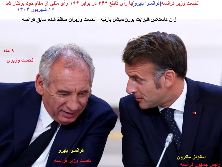 نمایندگان پارلمان فرانسه روز دوشنبه۸ سپتامبر ۲۰۲۵(۱۷ شهریور ۱۴۰۴)با رأی قاطع ۳۶۴ در برابر ۱۹۴ رأی منفی «فرانسوا بایرو»را سرنگون کردند،«رئیس جمهورفرانسه» درهمان روزبرکناری نخست وزیر(فرانسوا بایرو)،«سباستین لکورنو»(به نخست وزیری منصوب کرد)
