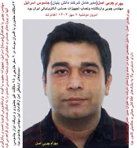 توضیح مدیریت سایت-پیراسته فر:مدیرعامل شرکت دانشبنیان دیتابیس(بهرام چوبی اصل)جاسوس اسرائیل بود،اعدام شد(۷ مهر ۱۴۰۴)
