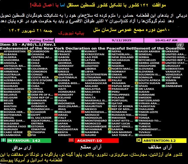 روز جمعه ۱۲ سپتامبر ۲۰۲۵(۲۱ شهریور ۱۴۰۴) با ۱۴۲ رأی موافق، ۱۰ رأی مخالف(اسرائیل و آمریکا،آرژانتین، مجارستان، میکرونزی، نائورو، پالائو، پاپوآ گینه نو، پاراگوئه و تونگا)و ۱۲ رأی ممتنع تصویب شد.