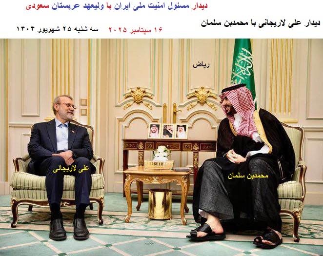 توضیح مدیریت سایت-پیراسته فر:«علی لاریجانی»رئیس شورای عالی امنیت ملی ایران، روز سه شنبه ۱۶ سپتامبر ۲۰۲۵(۲۵ شهریور ۱۴۰۴) در یک نشست کمسابقه سطح بالا بین رقبای منطقهای، پس از حمله اسرائیل به قطر در هفته گذشته، با «محمد بن سلمان»(ولیعهد عربستان سعودی) و برادرش«خالدبن سلمان»(وزیر دفاع عربستان سعودی)دیدار کرد.