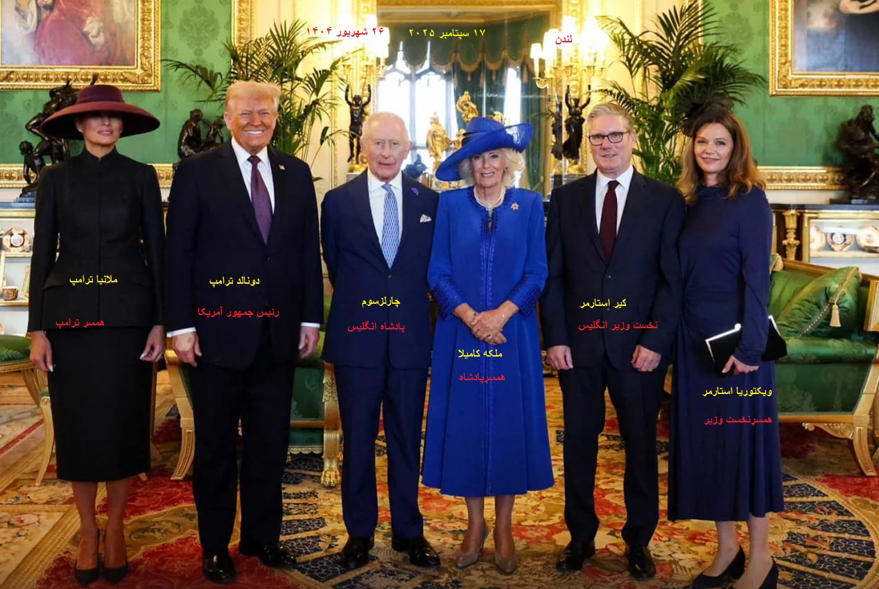 بترتیب از راست:«ویکتوریا استارمر»، «کی یر استارمر»(نخست وزیرانگلیس)،«ملکه کامیلا»، «چارلزسوم»(پادشاه انگلیس) ،«دونالدترامپ»(رئیس جمهور آمریکا) و«ملانیا ترامپ» ۱۷ سپتامبر ۲۰۲۵ لندن
