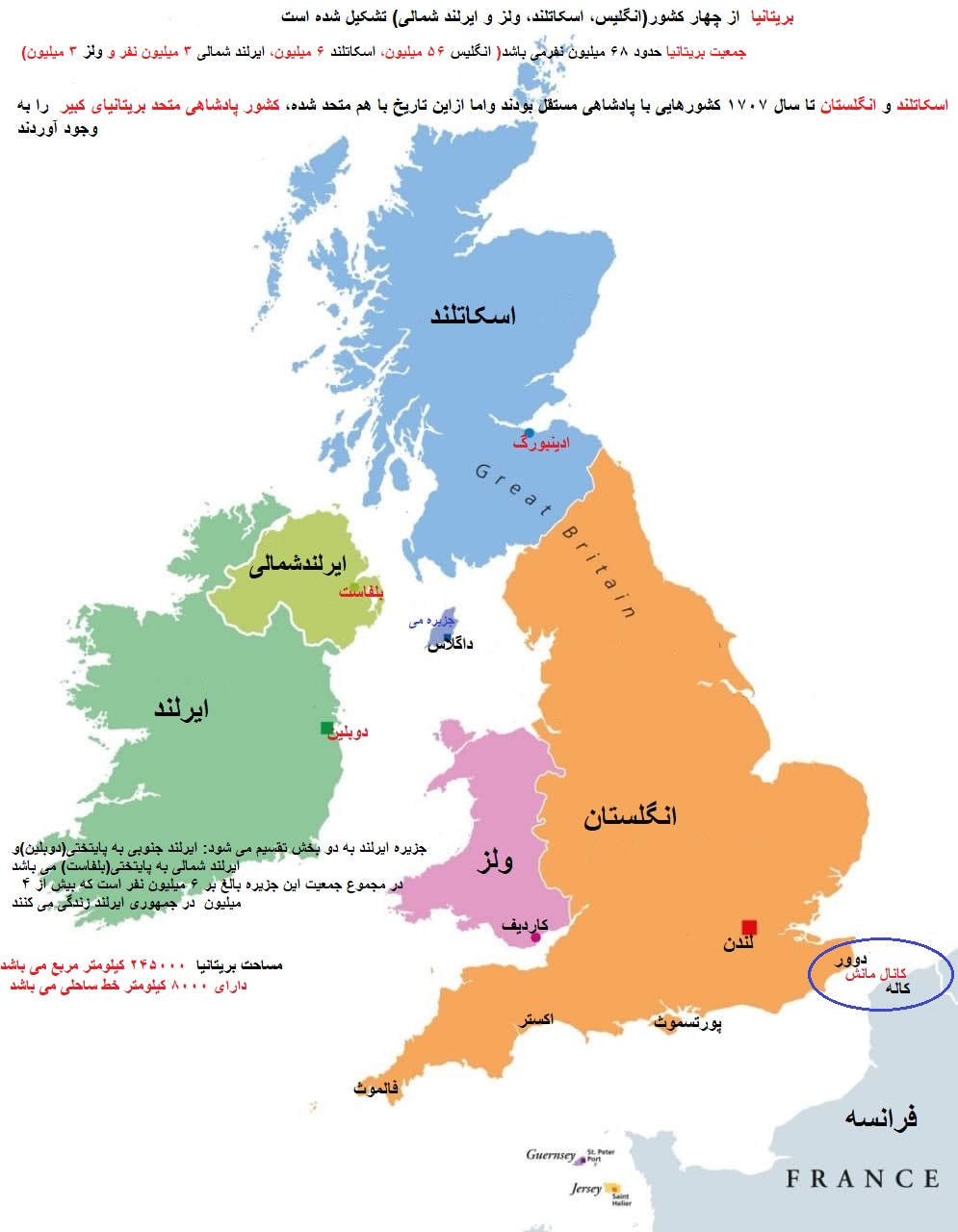 بریتانیا«» از چهار کشور(انگلیس، اسکاتلند، ولز و ایرلند شمالی) تشکیل شده است،با مساحت ۲۴۵۰۰۰ کیلومتر مربع دارای ۶۸ میلیون نفر جمعیت.
