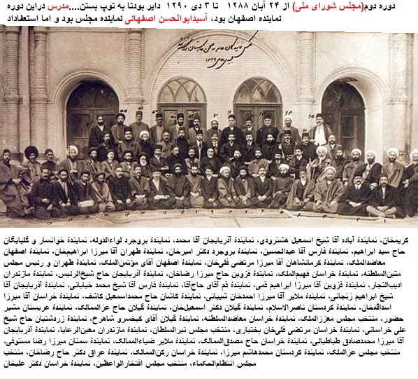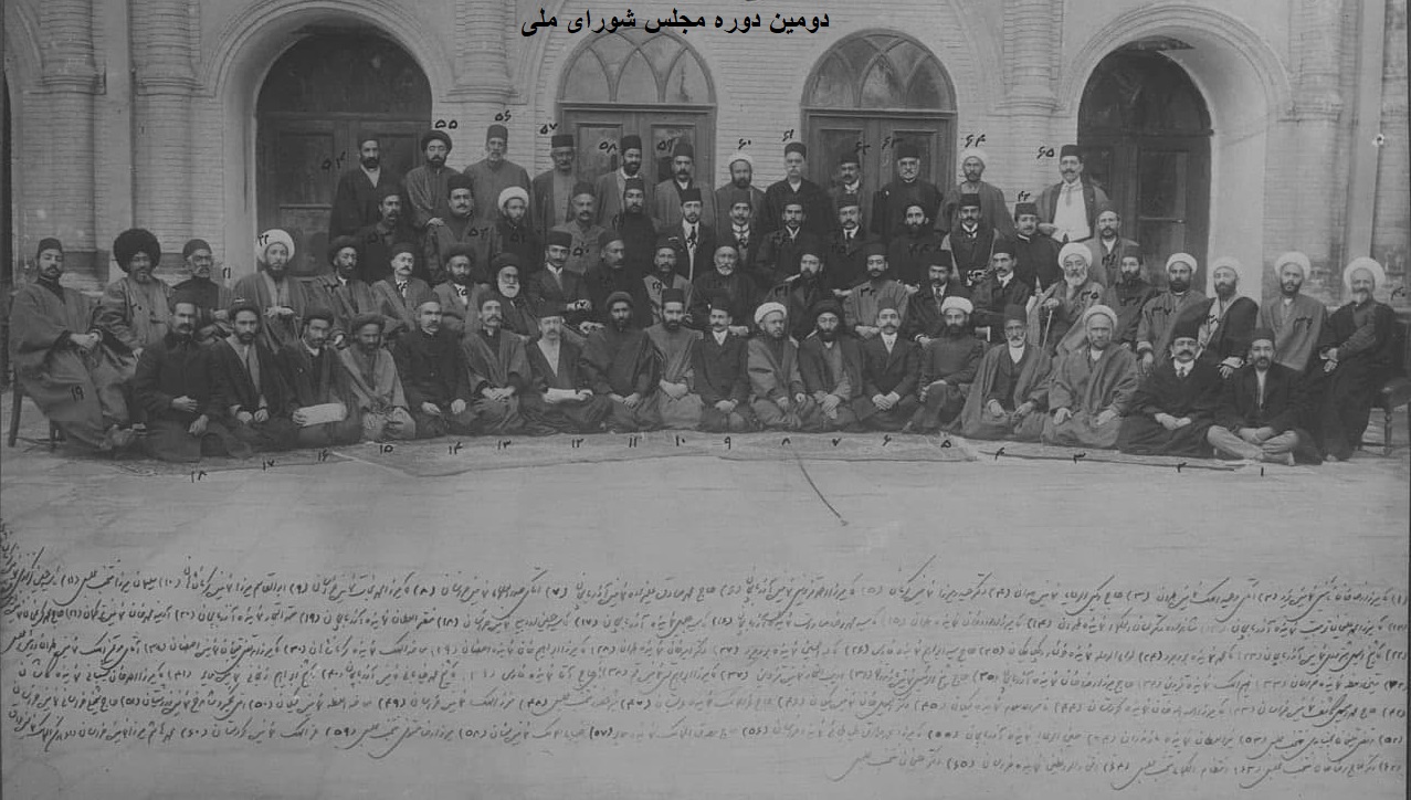 نمایندگان دورهٔ دوم مجلس شورای ملی: آقا میرزا رضاخان نائینی، نمایندهٔ یزد آقای وحیدالملک، نمایندهٔ طهران حاج وکیلالرعایا، نمایندهٔ طهران دکتر حیدرمیرزا، نمایندهٔ کرمان آقا میرزا احمد قزوینی، نمایندهٔ آذربایجان حاج محمدصادق علیزاده، نمایندهٔ آذربایجان آقای صدرالعلماء، نمایندهٔ خراسان آقا میرزا محمد نجات نمایندهٔ خراسان ابوالقاسم میرزا، نمایندهٔ کرمانشاهان سلیمان میرزا، منتخب مجلس آقای سید حسین کزازی، نمایندهٔ کرمانشاه آقا میرزا محمد علیخان تربیت، نمایندهٔ آذربایجان شاهزاده دکتر لسانالحکماء، نمایندهٔ طهران آقا میرزا داودخان، نمایندهٔ طهران آقا سید محمدرضا سادات، نمایندهٔ آذربایجان آقا سید جلیل، نمایندهٔ آذربایجان آقا سید حسین اردبیلی، نمایندهٔ خراسان سنقرالسلطان، نمایندهٔ آذربایجان معتمدالتجار، نمایندهٔ آذربایجان آدینه محمدخان، نمایندهٔ ترکمان حاج محمد کریمخان، نمایندهٔ آباده آقا شیخ اسمعیل هشترودی، نمایندهٔ آذربایجان آقا محمد، نمایندهٔ بروجرد لواءالدوله، نمایندهٔ خوانسار و گلپایگان حاج سید ابراهیم، نمایندهٔ فارس آقا عبدالحسین، نمایندهٔ بروجرد دکتر امیرخان، نمایندهٔ طهران آقا میرزا ابراهیمخان، نمایندهٔ اصفهان معاضدالملک، نمایندهٔ کرمانشاهان آقا میرزا مرتضی قلیخان، نمایندهٔ اصفهان آقای مؤتمنالملک، نمایندهٔ طهران و رئیس مجلس متینالسلطنه، نمایندهٔ خراسان فهیمالملک، نمایندهٔ قزوین حاج میرزا رضاخان، نمایندهٔ آذربایجان حاج شیخالرئیس، نمایندهٔ مازندران ادیبالتجار، نمایندهٔ قزوین آقا میرزا ابراهیم قمی، نمایندهٔ قم آقای حاجآقا، نمایندهٔ فارس آقا شیخ محمد خیابانی، نمایندهٔ آذربایجان آقا شیخ ابراهیم زنجانی، نمایندهٔ ملایر آقا میرزا احمدخان شیبانی، نمایندهٔ کاشان حاج محمداسمعیل کاشف، نمایندهٔ خراسان آقا میرزا اسداللهخان، نمایندهٔ کردستان ناصرالاسلام، نمایندهٔ گیلان دکتر اسمعیلخان، نمایندهٔ گیلان حاج عزالممالک، نمایندهٔ عربستان مشیر حضور، منتخب مجلس معززالملک، نمایندهٔ خراسان معاضدالسلطنه، نمایندهٔ گیلان آقای کیخسرو شاهرخ، نمایندهٔ زردشتیان حاج شیخ علی خراسانی، نمایندهٔ خراسان مرتضی قلیخان بختیاری، منتخب مجلس نیرالسلطان، نمایندهٔ مازندران معینالرعایا، نمایندهٔ آذربایجان آقا میرزا محمدصادق طباطبائی، نمایندهٔ خراسان حاج مصدقالممالک، نمایندهٔ ملایر ضیاءالممالک، نمایندهٔ سمنان میرزا رضا مستوفی، منتخب مجلس عزالملک، نمایندهٔ کردستان محمدهاشم میرزا، نمایندهٔ خراسان رکنالممالک، نمایندهٔ عراق دکتر حاج رضاخان، منتخب مجلس انتظامالحکماء، منتخب مجلس افتخارالواعظین، نمایندهٔ خراسان دکتر علیخان