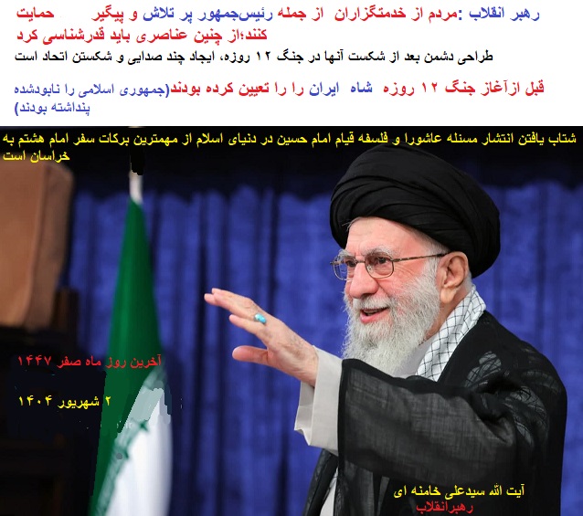 توئیت روز یکشنبه ۲۴ آگوست ۲۰۲۵(۰۲ شهریور ۱۴۰۴)بیانات رهبر انقلاب: مردم، خدمتگزاران کشور و رئیسجمهور را حمایت کنند. رئیسجمهور پرکار، پرتلاش و پیگیر است؛ این را باید قدرشناسی کرد.