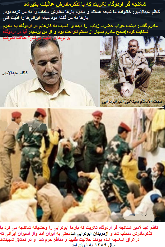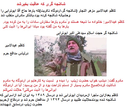 توضیح مدیریت سایت-پیراسته فر:«کاظم عبدالامیر مزهر النجار» معروف به«کاظم عبدالامیر»(شکنجه گر...اردوگاه تکریت) که بارهارحجت الاسلام سیدعلی اکبر ابوترابی را وحشیانه شکنجه می کرد با تذکرمادرش منقلب شد وازمریدان ابوترابی شد واو درسال ۱۳۸۹ به ایران آمد و ازاسیرانی که درعراق شکنجه شده بودند حلالیت طلبید وبه سوریه رفت«مدافع حرم»شد وسرانجام در دمشق شهیدشد