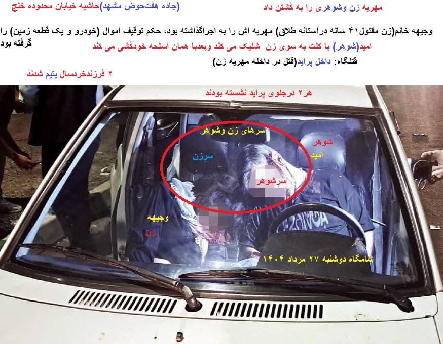 وجیهه خانم(زن مقتول۴۱ ساله درآستانه طلاق) مهریه اش با به اجراگذاشته بود، حکم توقیف اموال شوهرش (خودرو و یک قطعه زمین)را گرفته بود...شهرهر(امید)با کُلت به سوی زن شلیک می کند وبعدبا همان اسلحه خودکُشی می کند، داخل پراید(مهریه زن)سرهای آن ها هنگام مُردن به هم چسبیده بودند!