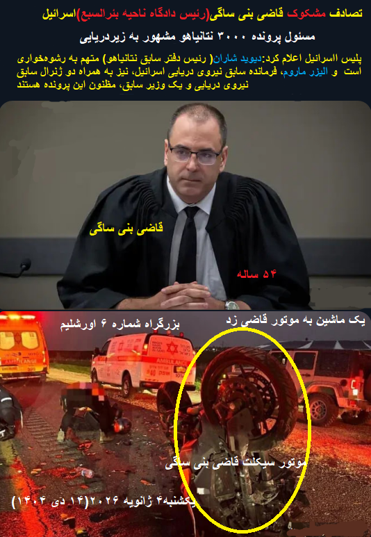رئیس دادگاه ناحیه بئرشبع اسرائیل»(بنی ساگی) روز یکشنبه(۱۴ دی ۱۴۰۴) در یک تصادف رانندگی در بزرگراه ۶ کشته شد.