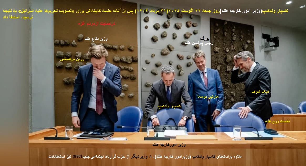 توضیح مدیریت سایت-پیراسته فر:«وزیر امور خارجه هلند»(کاسپار ولدکمپ) از حزب میانهرو «قرارداد اجتماعی جدید» (NSC)، روز جمعه ۲۲ آگوست ۲۰۲۵(۳۱ مرداد ۱۴۰۴) در پی اختلاف بر سر تحریمها علیه اسرائیل استعفا داد،سایر وزرای حزبش نیز از ائتلاف خارج شدند.