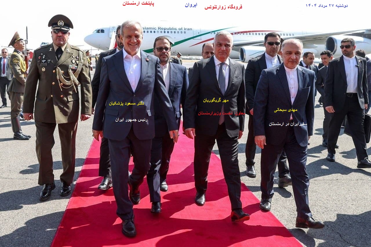 رئیس جمهور ایران در (فرودگاه زوارتنوتس ایروان) مورد استقبال(مهر گریگوریان)«معاون نخست وزیر ارمنستان» قرار گرفت(۲۷ مرداد ۱۴۰۴)