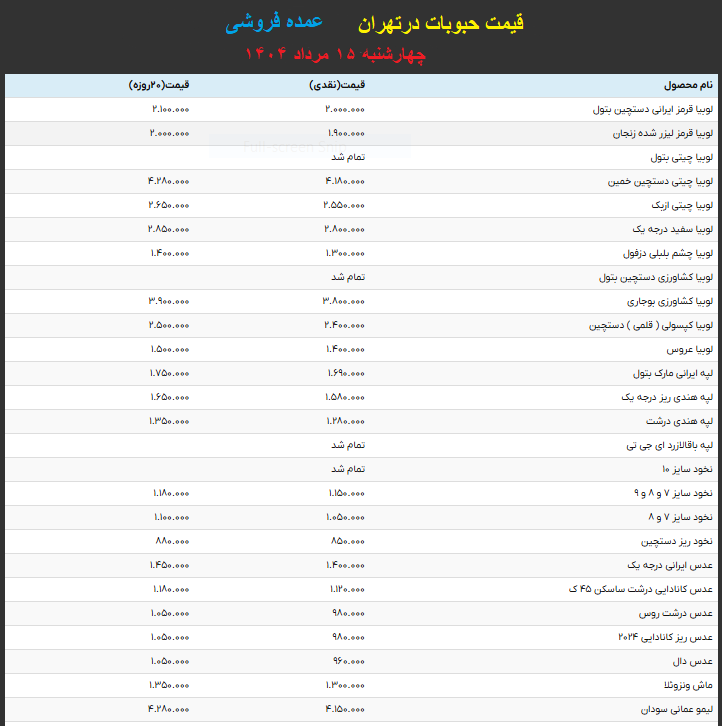 «قیمت خشکباروحبوبات در تهران»(عمده فروشی)چهارشنبه ۱۵ مرداد ۱۴۰۴