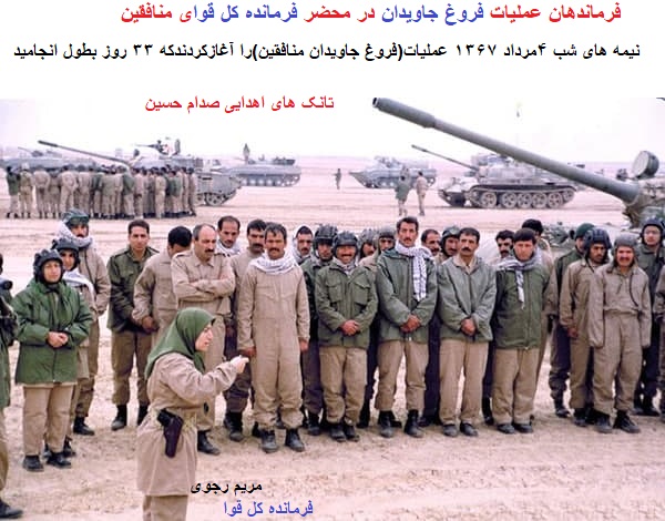 گزیده های سخنرانی رئیس منافقین +همسررئیس، درشب حرکت ازعراق بسمت ایران برای «عملیات فروغ جاویدان»،درادامه از بریدگان سازمان منافقین وحتی خاطرات نیروی منافقین که توفیق توبه نداشتند(درعملیات حضورداشتند)رامی آورم.