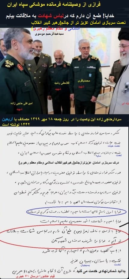 شهادت سردارحاجی زاده در اولین روز جنگ ۱۲ روزه(سحرگاه جمعه ۲۳ خرداد ۱۴۰۴)این وصیت نامه در مهر ۱۳۹۹ مصادف با اربعین ۱۴۴۲ نوشته شده است یعنی(۵ سال پیش درایام کرونا)