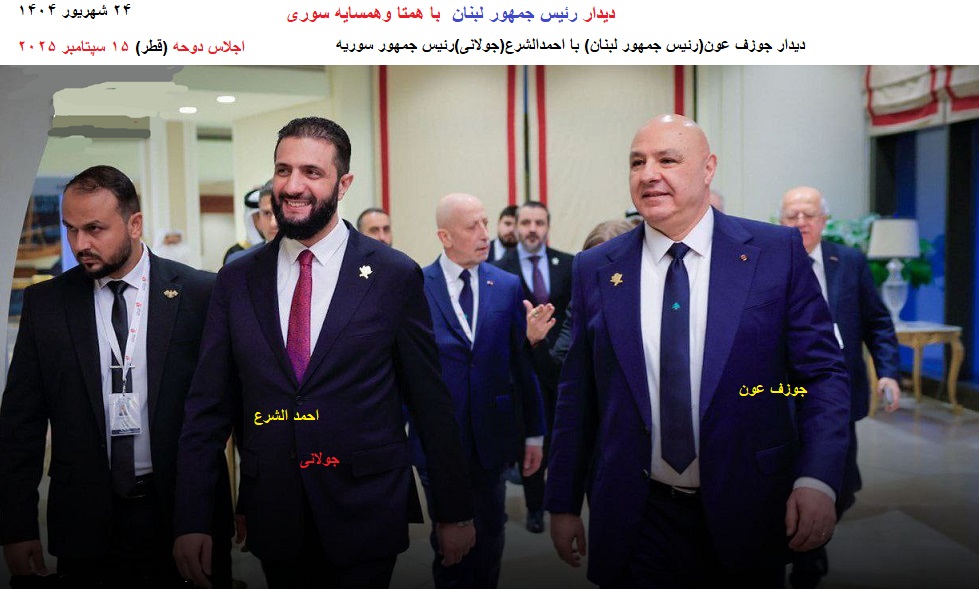 دیداررئیس جمهور لبنان(جوزف عون) با (رئیس جمهورسوریه)احمدالشرع...جولانی .اجلاس دوحه (قطر) ۱۵ سپتامبر ۲۰۲۵(۲۴ شهریور ۱۴۰۴)
